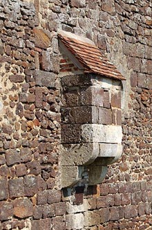Toute l'escarpe est faite avec des blocs de pierre bien réguliers, bien taillés, assurant ainsi la solidité de la base du château. Ce travail, assuré par les tailleurs de pierre, était très long et très coûteux. Les seigneurs du Moyen Age, dans un souci d'économie et de rapidité d'exécution, ont donc alterné les couches de pierres taillées avec des couches en pierres plus grossières, dont seule une face était plane. Cette façon de construire avait l'avantage d'être plus rapide et donc de coûter moins cher. A l'origine, cette alternance existait jusqu'en haut des tours. On le voit bien dans la tour Sud-Est qui est d'origine et a gardé ses meurtrières ainsi que ses corbeaux qui soutenaient les hourds.