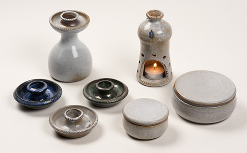 De gauche à droite et de haut en bas : Bougeoir forme haute ; Brûle-parfum à bougie ; Bougeoirs-bobèche ; Cendriers N°1 et N°2 (Voir les prix : Service à tabac)