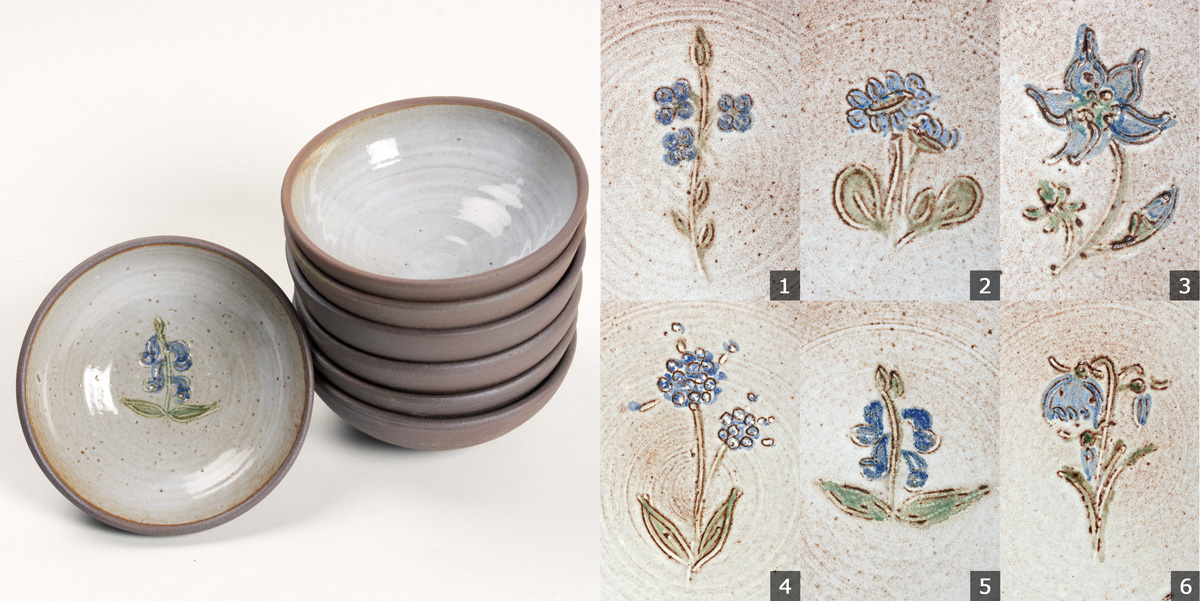 Coupelles avec fleur : 1 – Véronique ; 2 – Pâquerette ; 3 – Edelweiss ; 4 – Scabieuse ; 5 – Digitale ; 6 – Campanule.