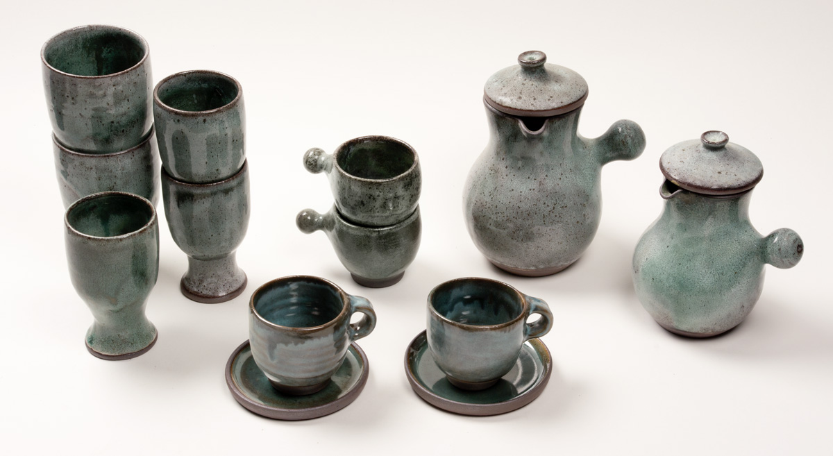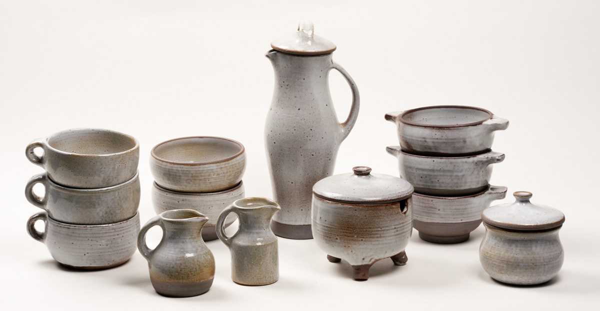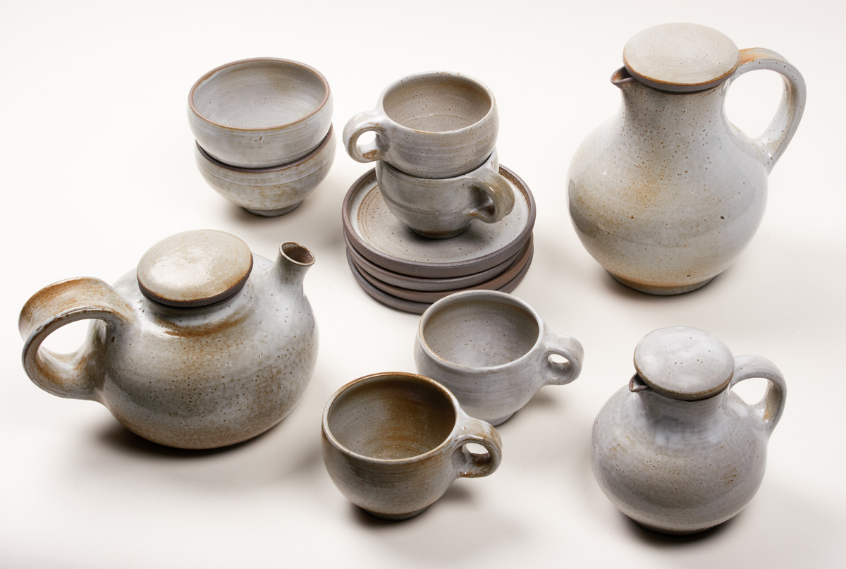 De gauche à droite et de haut en bas : Petites tasses à déjeuner à anse ; Bols à déjeuner N°2 ; Cafetière verseuse à anse ;Bols à oreille ; Crémiers ; Pot à miel ; Confiturier N°1